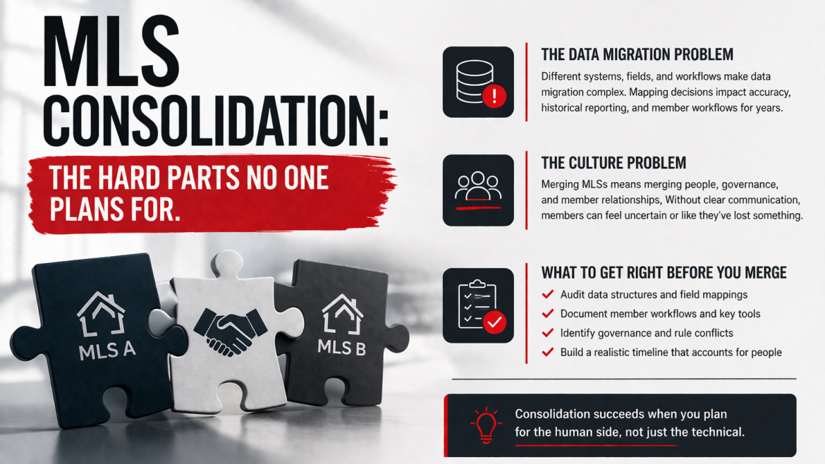 Data gets the most attention, but culture is often the harder challenge. MLSs have distinct member relationships, staff identities, and governance structures. Merging two organizations means navigating whose rules apply, whose board has authority, and whose members feel like they lost something.